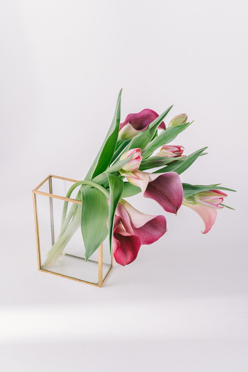 チューリップのつぼみは少しずつ表情を変え、カラーは流れるような曲線で空間に動きをつくります。