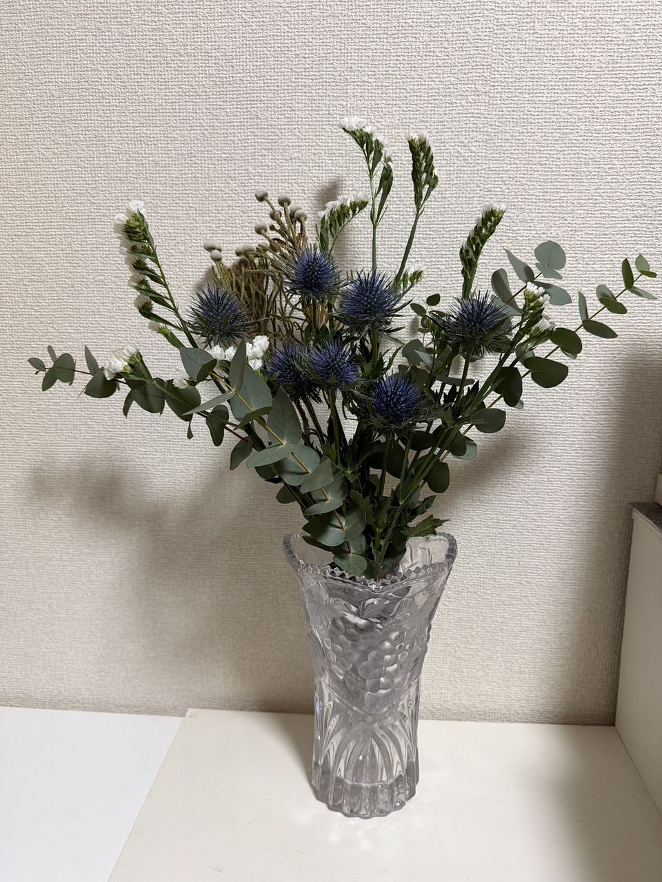箱から出した時は ボリュームも少なく地味に感じましたが、花瓶にいれてみたらいい感じに仕上がりました。 シルバーブルジア?の白さと大きさ、ユーカリの葉の小ささがイメージと違うものの概ね満足です。 ユーカリはだいぶ下の方の枝をカットして そのうちのいくつかと 折れてしまっていたエリンジウムとあわせて 小さな花瓶にセットしたらこれはこれで可愛かったです。暫くは花瓶で楽しんで、そのあとはスワッグにしたいと思います。 送料込でこの値段なら大満足。