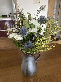 ヒバなど深い森の香りが楽しめるグリーンと、エリンジウムなど涼しげな花を合わせました。