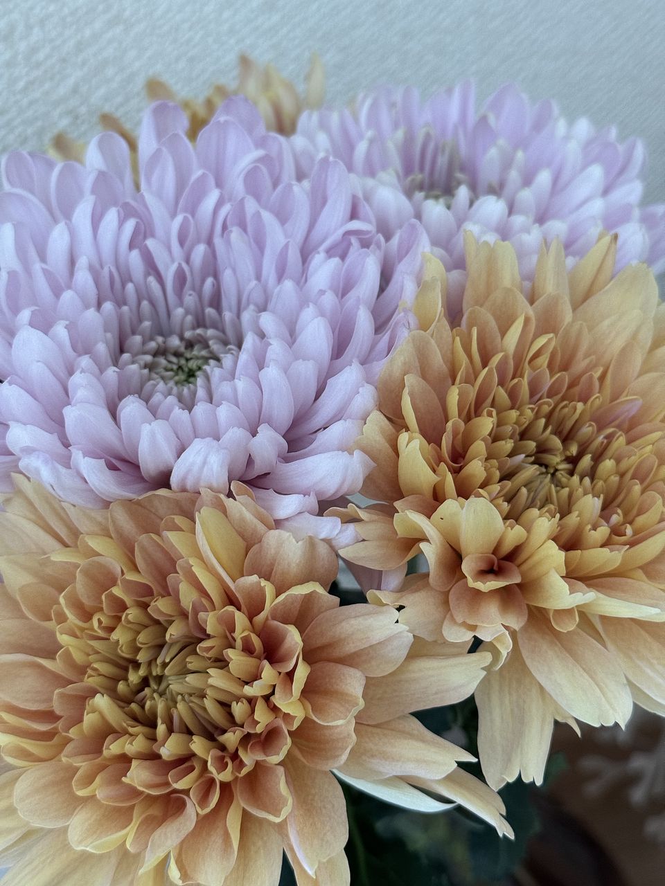 春色マム、届きました。淡い色合いで良きです。 ネットに包まれ大事に梱包してくださってたので 自分でも慎重ににネットを外しましたが 白いマムの花弁がポロポロと落ちてしまったのは悲しい --宅配会社の営業所に横倒しで届いたとのことで 確認をし大丈夫でしたが、ほかにもこのような事があるのかな、大事に届けていただきたいと思います。