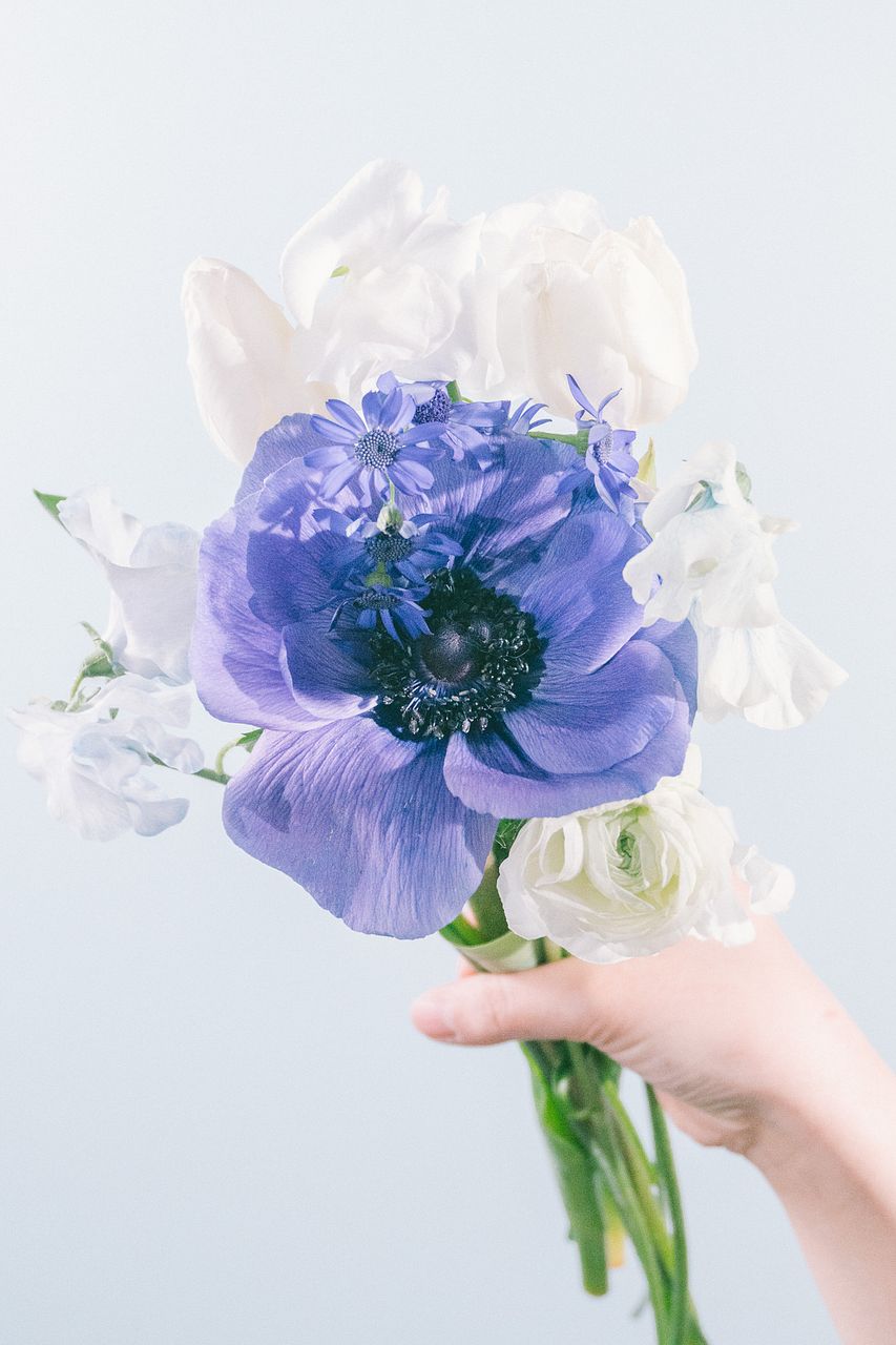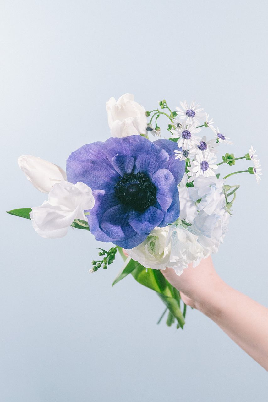 澄んだブルーのアネモネを主役に、やわらかな白い花々をふんわりと束ねました。