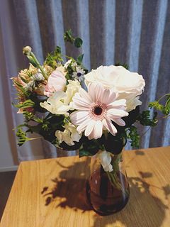 ガーベラやバラ、やさしいニュアンスカラーが重なり合い、甘すぎない大人のかわいさを演出します。