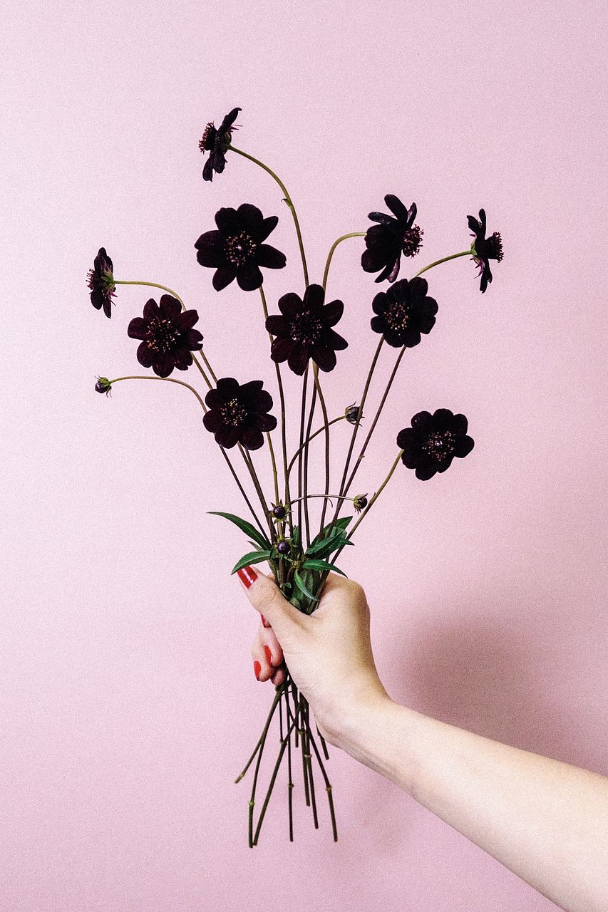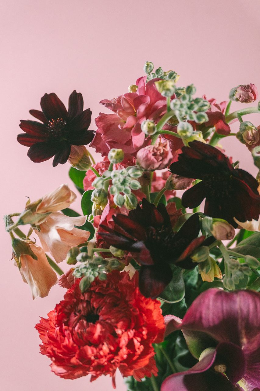 ボルドーのラナンキュラスやバラ、ブラックのチョコレートコスモス、くすみピンクのストックを合わせたシックなカラーのブーケです🍫