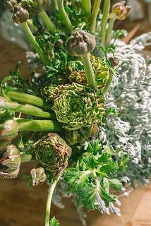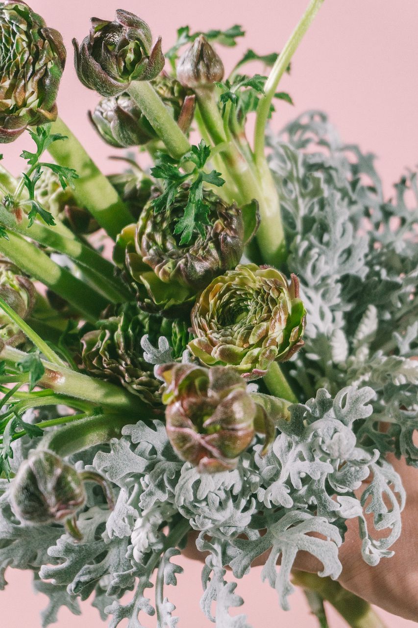 ラナンキュラス「ポンポンキャンディー」の蕾とシルバーカラーが魅力的なホワイトリーフ「ダスティミラー」を組み合わせたブーケ💐