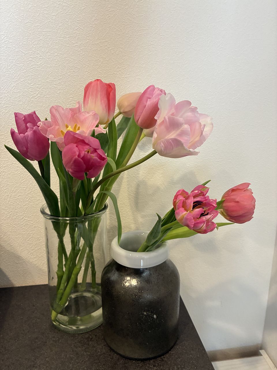 一重咲き、八重咲き、パーロット咲き、クラウン咲き。表情のちがうピンクのチューリップを、ぎゅっと10本集めました🌷