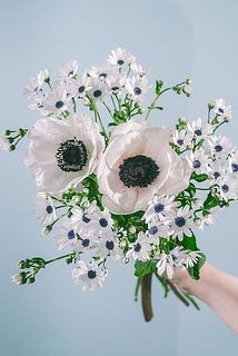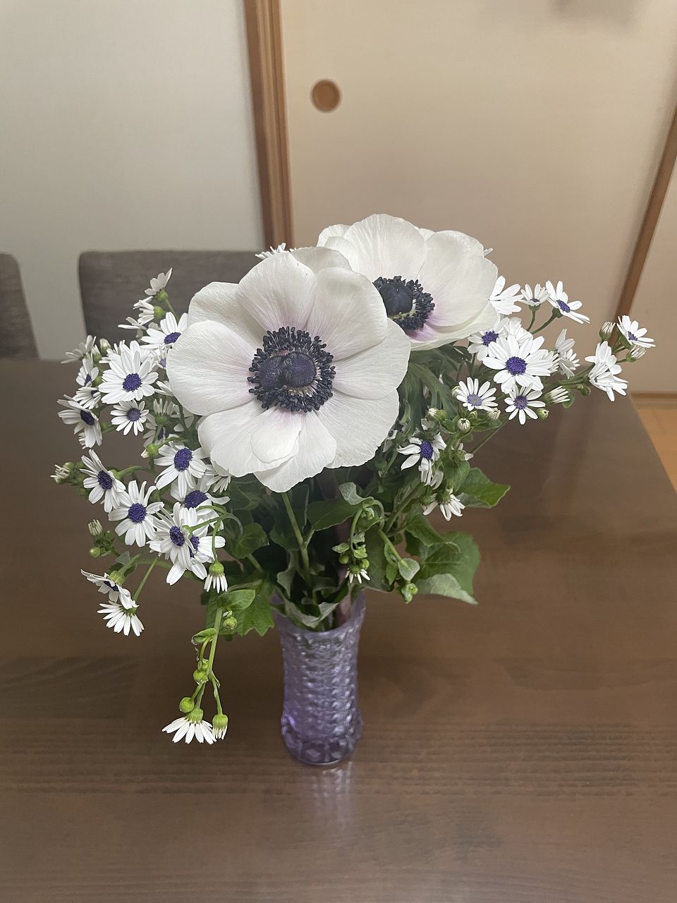 珍しいホワイトのアネモネ「ホワイトブラックセンター」とサイネリア「ティアスノーブルーアイ」を贅沢に束ねて🦋