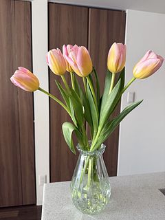 初めて見たチューリップ🌷 淡いピンクとイエローの花びらが、なんとも可愛い🩷 届いてから、しっかり水揚げしたことでピンと元気に咲いてます🌷