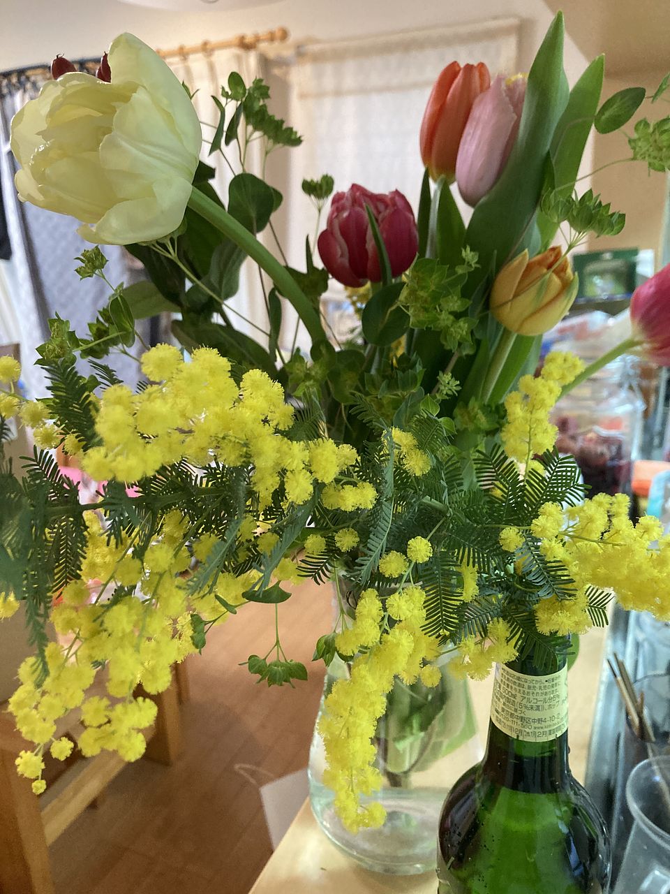 チューリップとミモザが主役の贅沢な春のおまかせブーケがお買い得になりました!いつもより200円お得です🉐