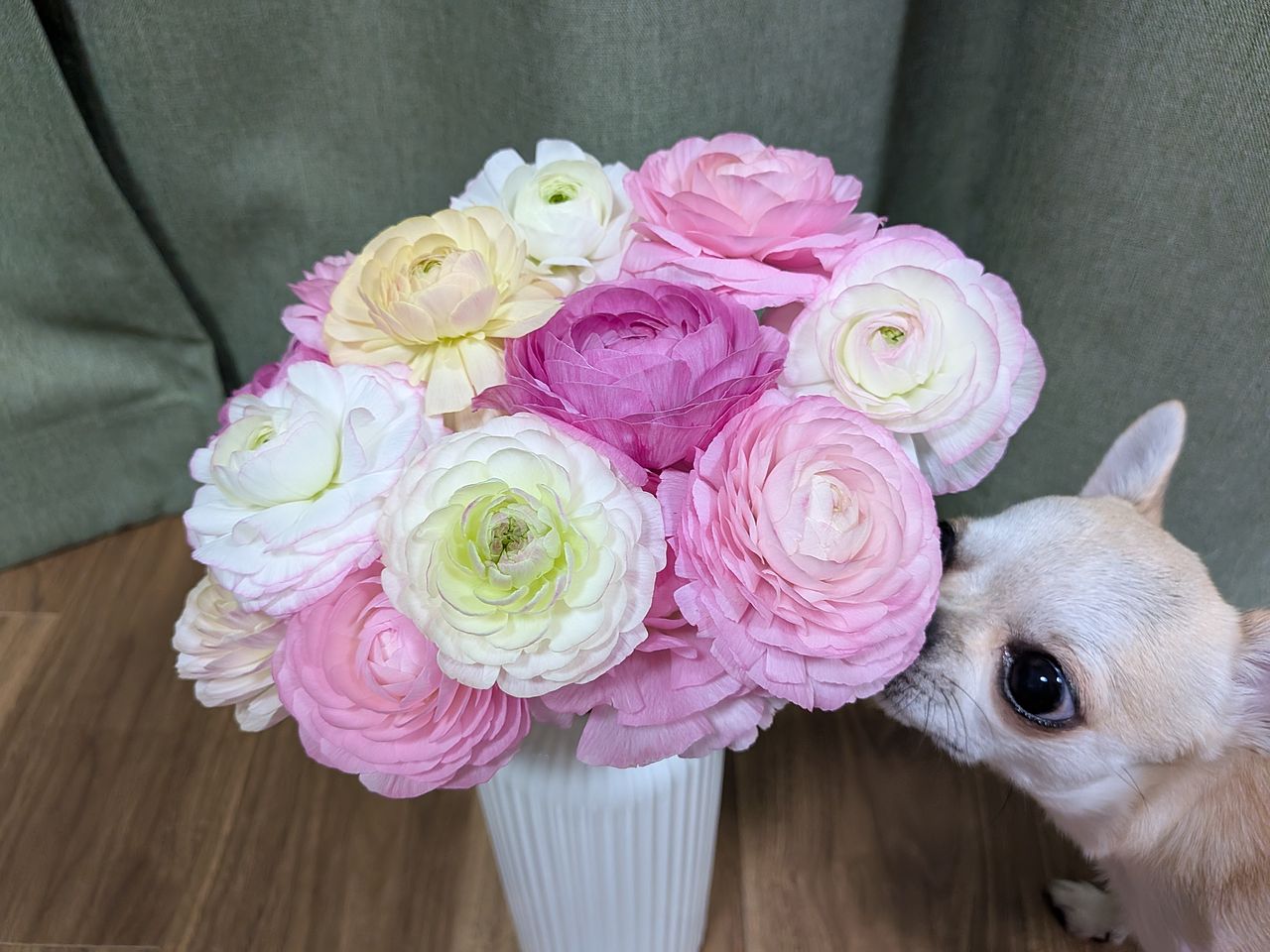 ラナンキュラスの花びらはお届け時、外側にめくれている場合も。優しく手で戻していただくと目立たなくなります。