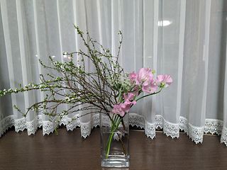 雪柳のボリュームがすごくて、どの様に生けるか 思案中。