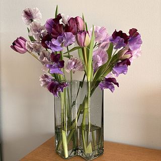 淡い紫を中心に丸みのあるチューリップとふんわり軽やかなスイートピー。