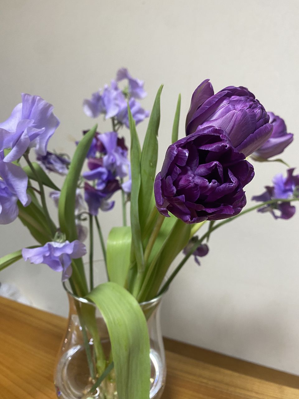 濃い紫のチューリップだったら良いなと思っていましたが、その通りでテンション上がりました!スイートピーもツートンカラーと絞りのミックスでとても良い香り!大満足でした
