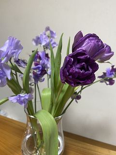 とても素敵な紫系のブーケでした。チューリップ、スイートピー、ともに2種類以上あり、色のニュアンスがやわらかい! 新鮮な、元気な状態で届きました。ユーカリやローズマリーと合わせていけました♪♪