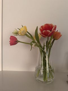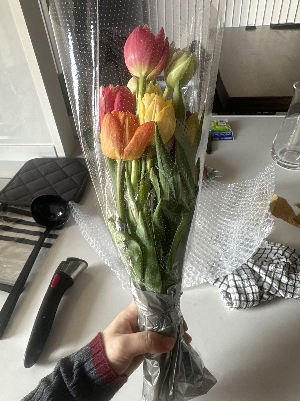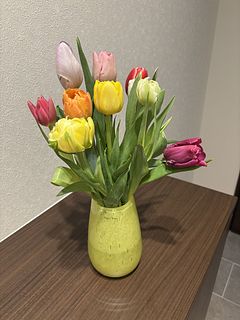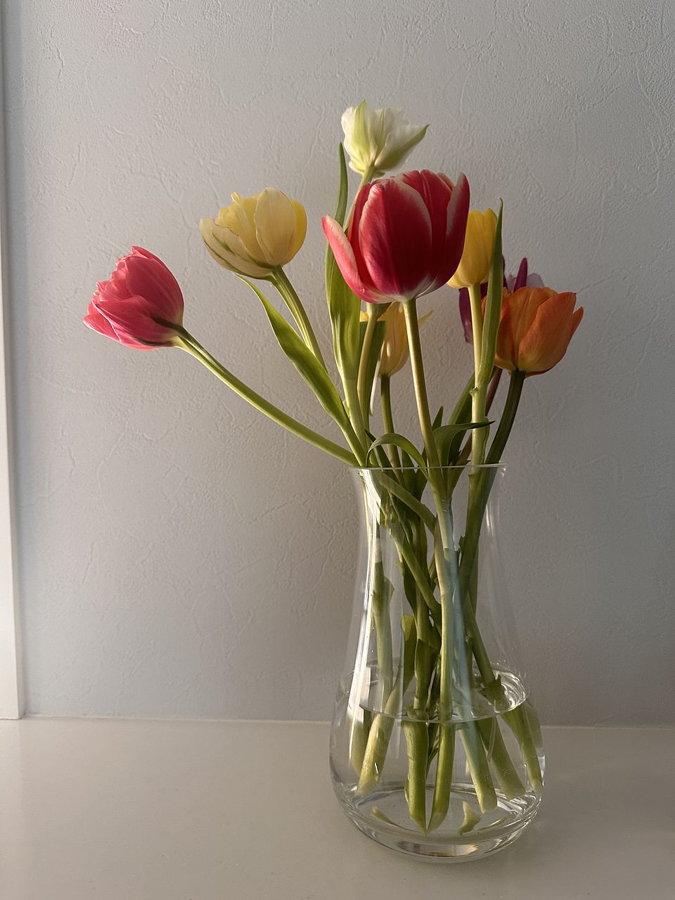 新居に引越して、お家に彩りが欲しくて注文させていただきました。恥ずかしながら自分で家に置くためにお花を買う事自体初めてで...。色とりどりの可愛いチューリップが届いてとっても幸せな気持ちになりました! お手入れの仕方もわかりやすく満足です。 最初は傾いていたチューリップが届いて暫くするとお水を吸って元気に真っ直ぐになってて...(当たり前なのかもしれませんが私にとっては嬉しくて☺️)