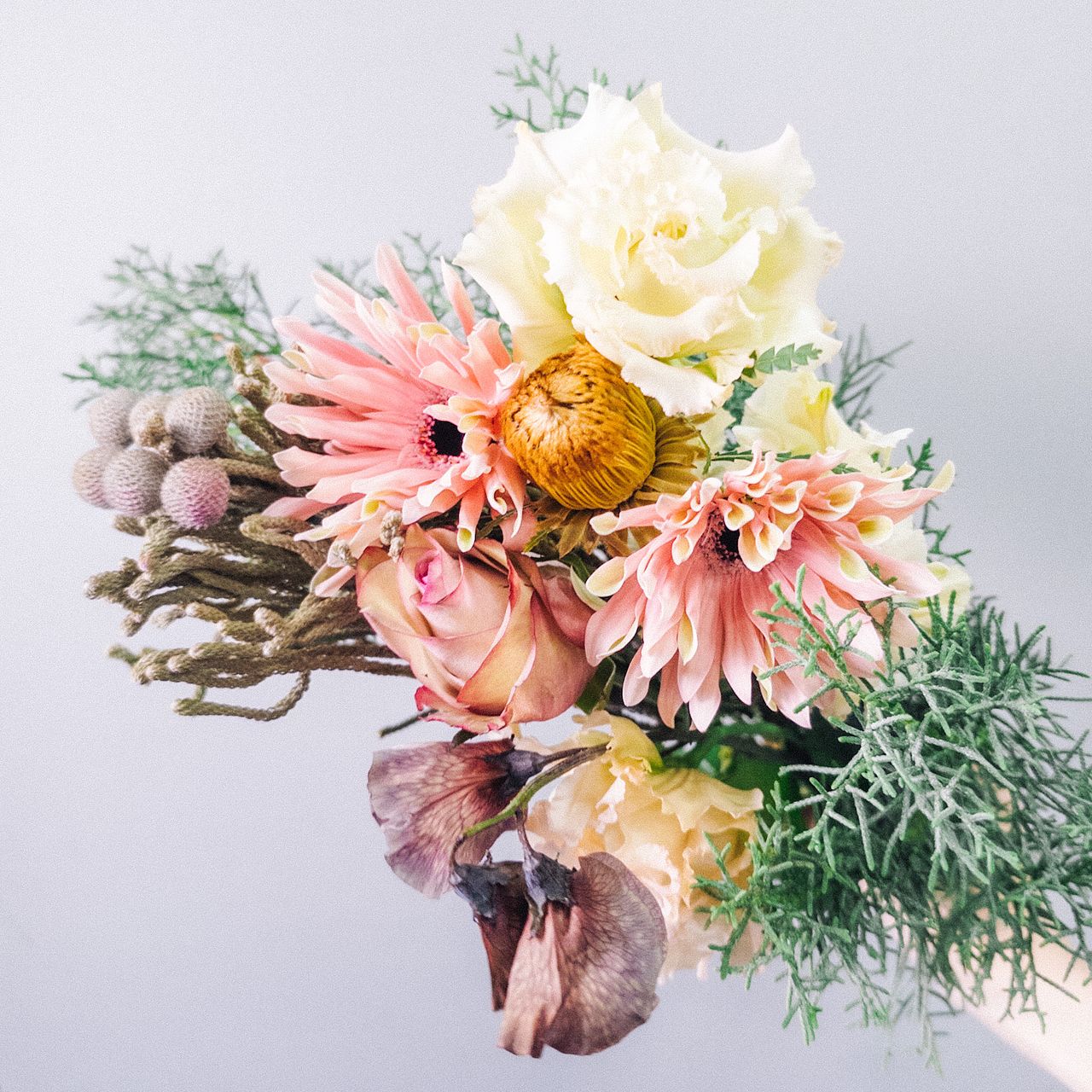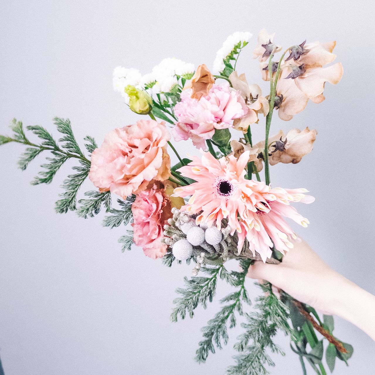 やわらかなロゼやベージュの花をふんわりと束ねたブーケ。
