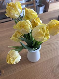 とても幸せです。良い香りがして毎日テンションあがります^_^ 出来るだけ長持ちさせたいので、玄関に置いています。家に帰るのが楽しみです。勧められたように水を浅くして生けました、毎日水を確認してチューリップにスキンシップしています。水曜日に届いてまだまだ美しいです。フラワーショップで買ったのは当たり外れがあり2〜3日で首がダレて来たりがありましたが、このチューリップは見てからに元気な状態で届きました。買って良かったです。