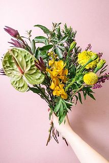 みどり色がかわいい「アンスリウム」をアクセントに、あたたかい地域から来た花たちがリゾート気分を感じさせてくれます⛱マリーゴールドはまるで太陽のよう☀️