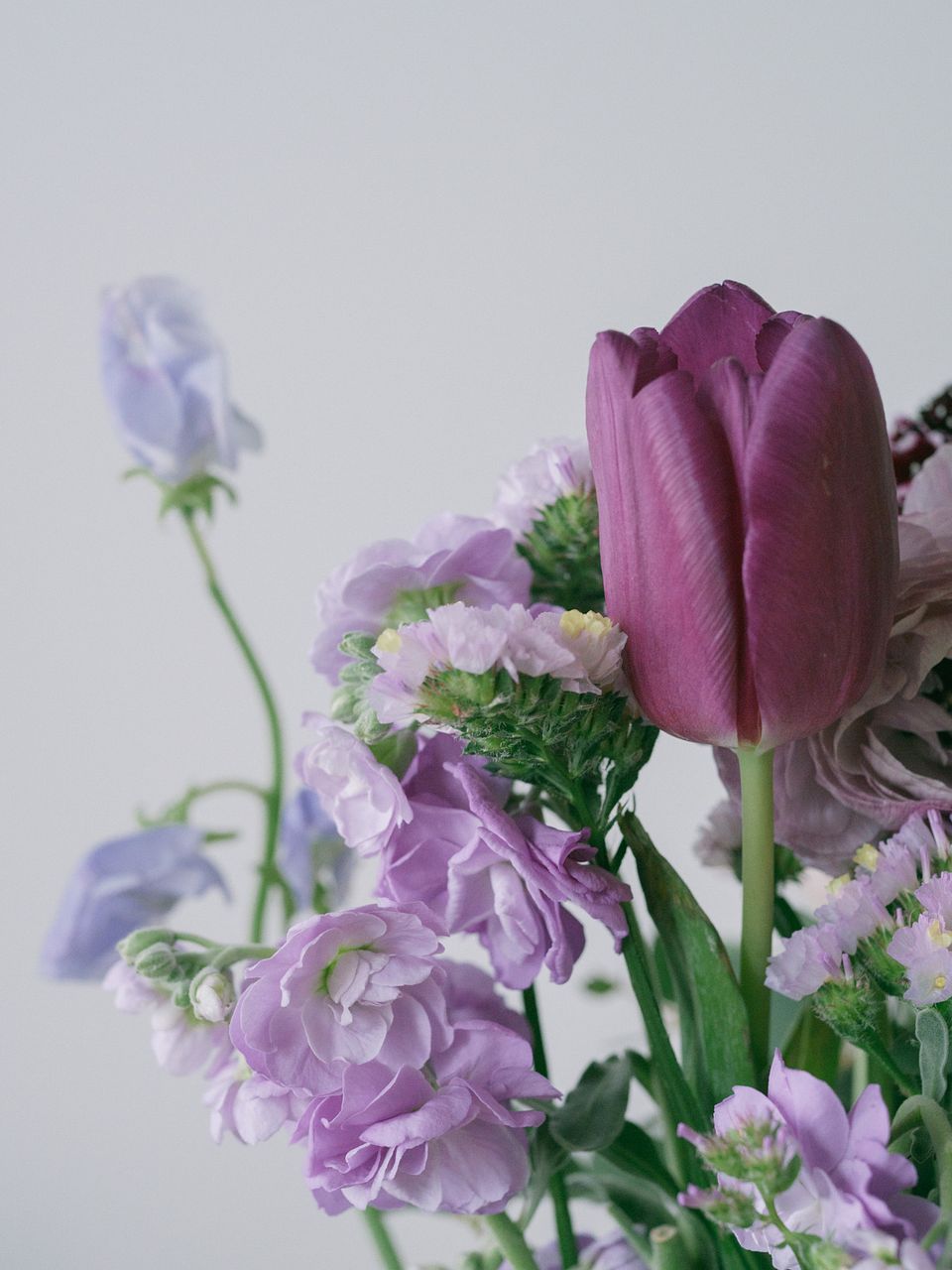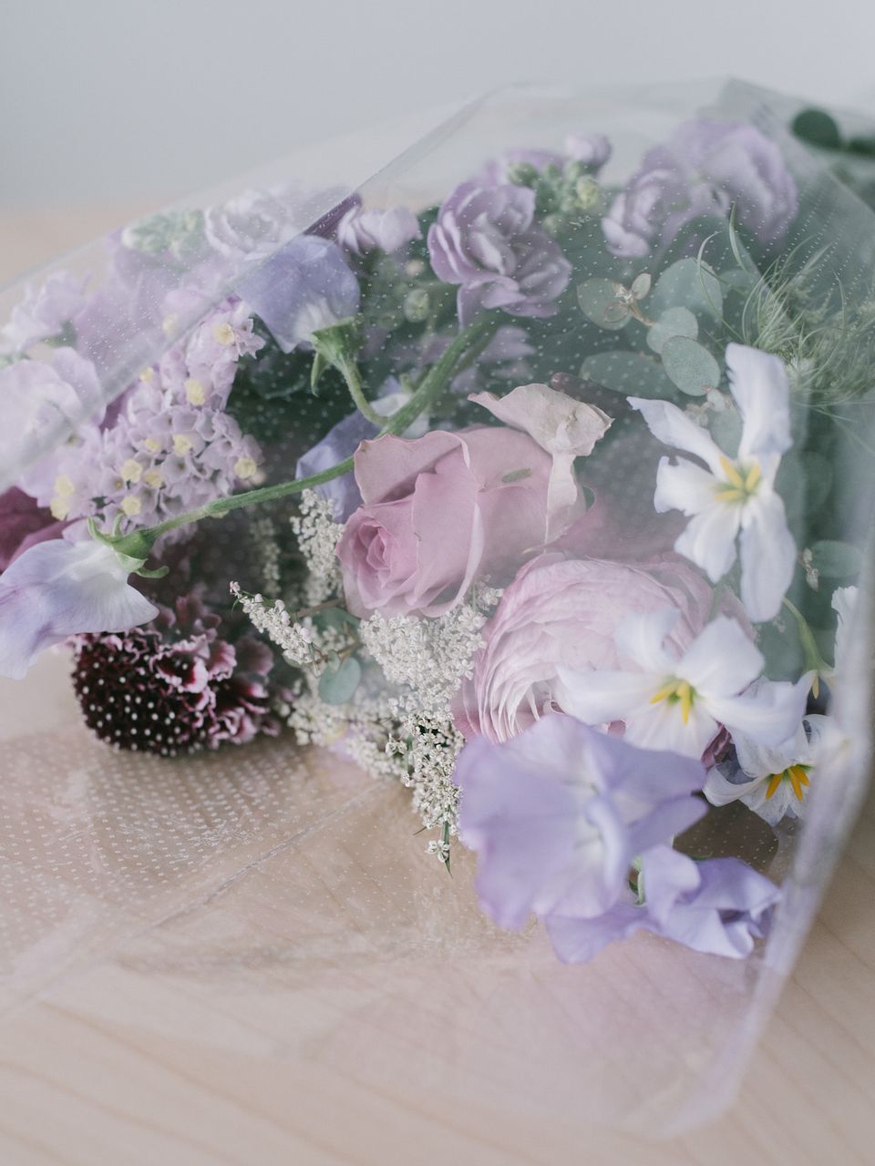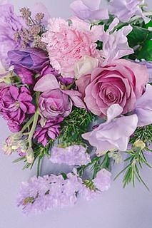 ラベンダーカラーのバラと香りも楽しめる春のお花をあわせて神秘的な雰囲気に。