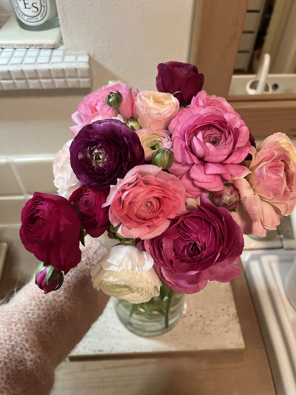 濃淡のバラエティ豊かなピンクのラナンキュラスをたっぷり束ねて。