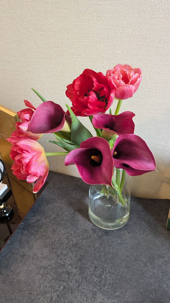シックで大人っぽい色合いで良かったです☺️ チューリップが1本少し潰れてしまっていたのが 残念でしたが許容範囲です!! 小さなチューリップ、と書いてあったので、もう少し小ぶりな可愛らしいチューリップなのかな?と思っていましたが八重咲き(?)のボリュームのあるチューリップでした! 個人的には小ぶりなシンプルなチューリップでも可愛かったかな、と思いました🌷