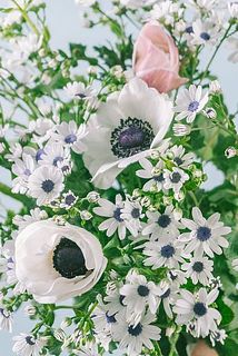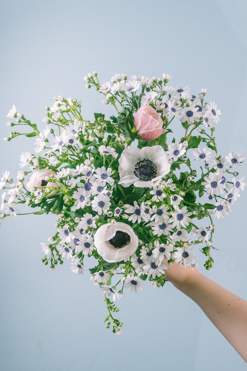 珍しいホワイトのアネモネ「ホワイトブラックセンター」とサイネリア「ティアスノーブルーアイ」を贅沢に束ねて🦋