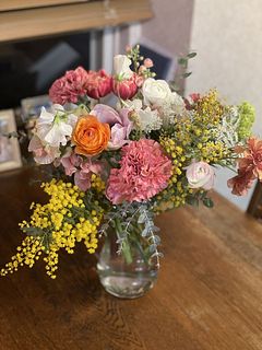 スパイラルに組まれていて葉の処理もしてあるのでそのまま飾って楽しめます。たっぷり入っているので華やかです。内容は毎回おまかせですが、色の雰囲気は同じ雰囲気でお届け予定です。お楽しみに!