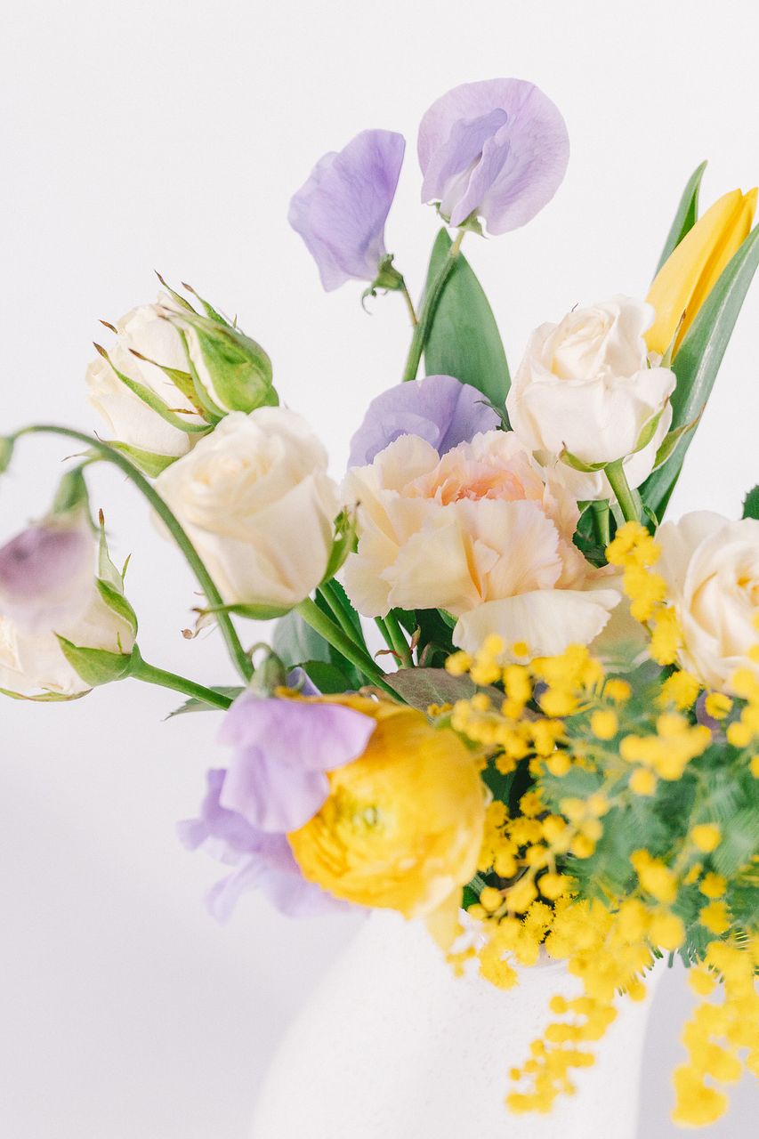 ミモザを中心とした黄色の花とラベンダー色のお花の反対色のコントラストが美しい💛