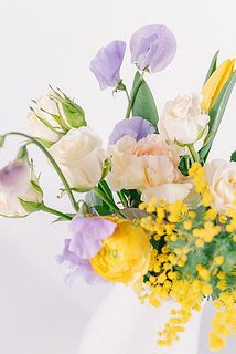 ミモザの明るい黄色と、ラベンダー色の花々を合わせたブーケ