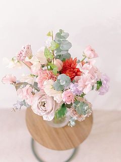 スパイラルに組まれていて葉の処理もしてあるのでそのまま飾って楽しめます。たっぷり入っているので華やかです。内容は毎回おまかせですが、色の雰囲気は同じ雰囲気でお届け予定です。お楽しみに!