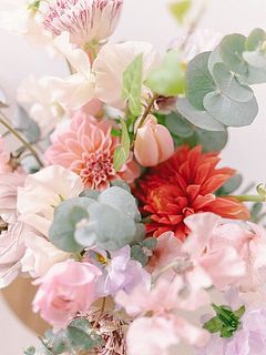 ダリアを主役に、ラナンキュラス、チューリップ、スイートピーなど春のお花を合わせたスパイラルブーケです🌸