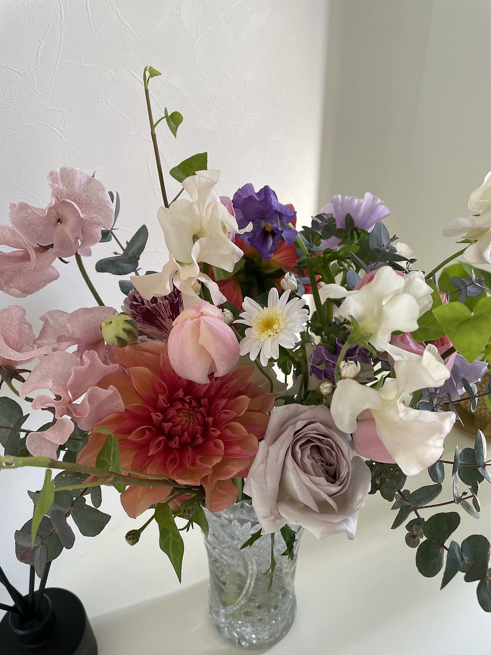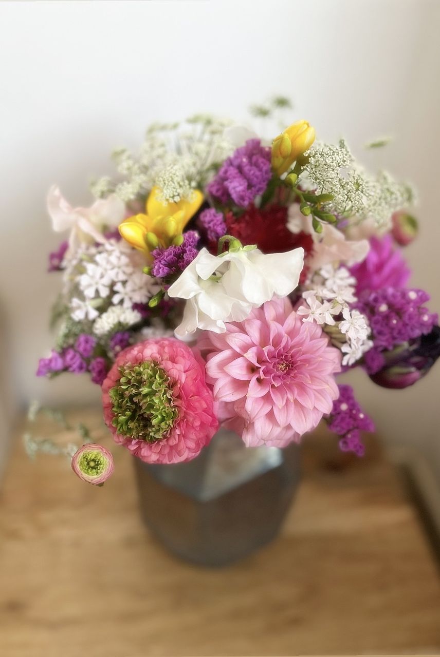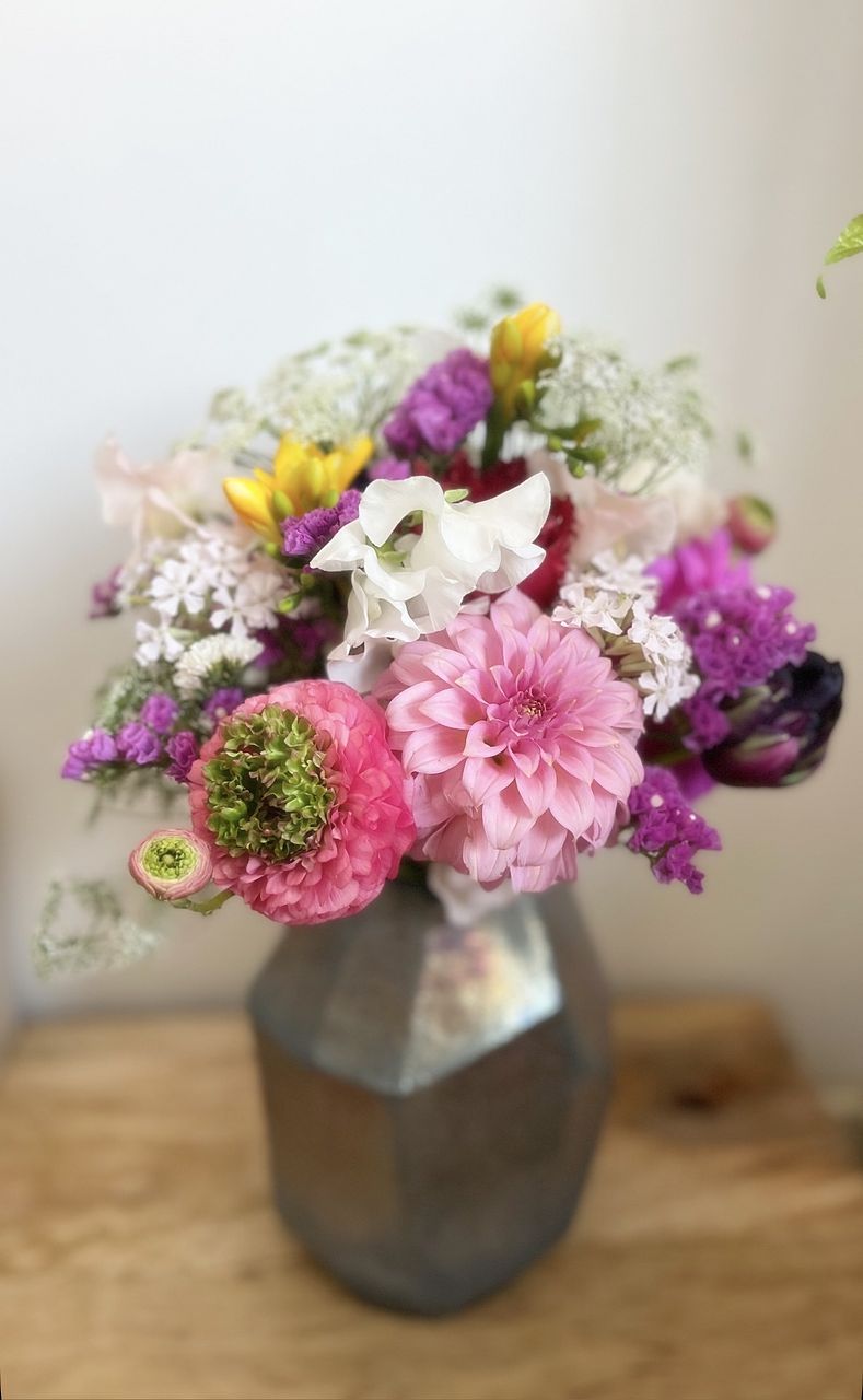 natsukiさんセレクトのお花をayaさんがブーケに!とライブで知って絶対ほしいと思ったのですが タイミングを逃して再販注文となり 赤黒いチューリップや紫スターチス、黄色いフリージアがアクセントの濃い赤紫系のブーケになりました。 でもLサイズのMarsにちゃんと生けたらちゃんと可愛くてキュン❣️🥹これはこれでとても可愛い😍 玄関に飾りました✨見るたびにほっこり。 前のブーケのレースフラワーがまだ元気だったので一緒に入れました。 変わり咲きの珍しいラナンキュラスも入っていて素敵です。 でもやっぱりayaさんのブーケもほしい… ayaさんブーケまた再販してください♡