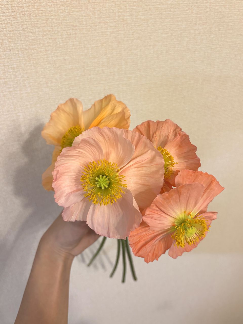 2回目のポピーです。 前回うつむいたつぼみが花開いた重さで3本ダメになってしまったので、今回は紙で巻いて水揚げしたらまっすぐに🌼 玄関を明るくしてくれる花たちです✨