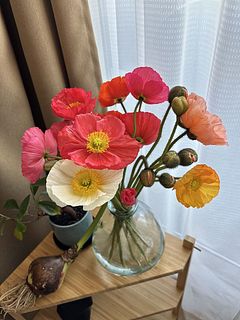 ほんとにたっぷり!めちゃくちゃかわいいです〜🥹🫶ずっと再販通知してた花器farbeとあわせて飾りました!写真は翌日と翌々日。届いたときは1つか2つだけ開いていて、ほかは蕾でした。ポピー明るくて元気なだけでなく繊細さもあってほんとにかわいい〜🥺また購入したいです!