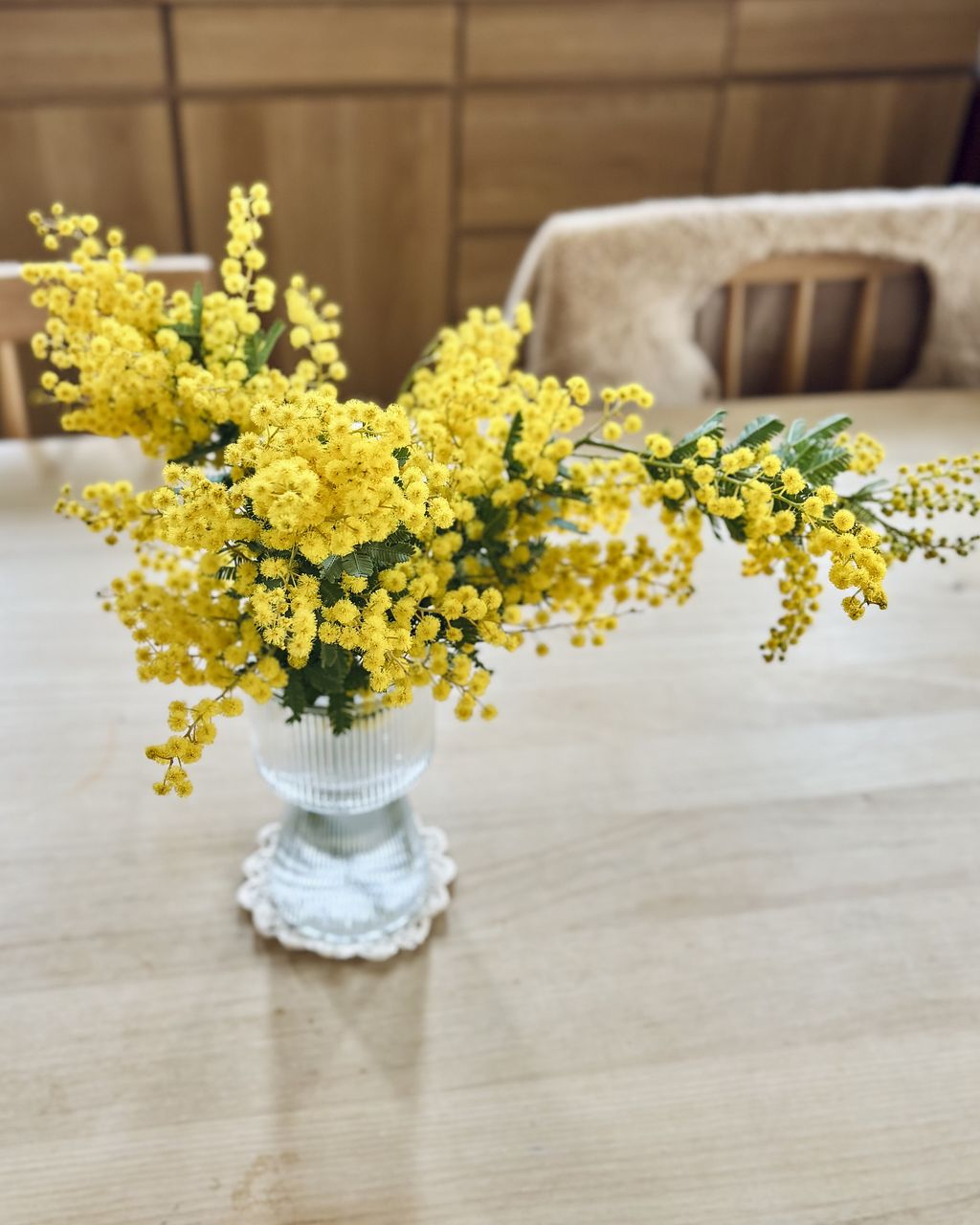 一点気になったのが、花の付き具合とボリュームをなくさない為に下枝ギリギリまで花や葉がきてると思うのですが、小さい花瓶ではバランスが悪いか倒れるので大きいサイズにしてますが、下枝ギリギリまで花がついており、水に漬けてしまうと腐るので水を少なくしてるのと、ガラスでない限り下の方は花が花瓶に隠れて見えない点です。