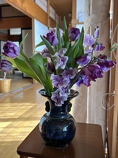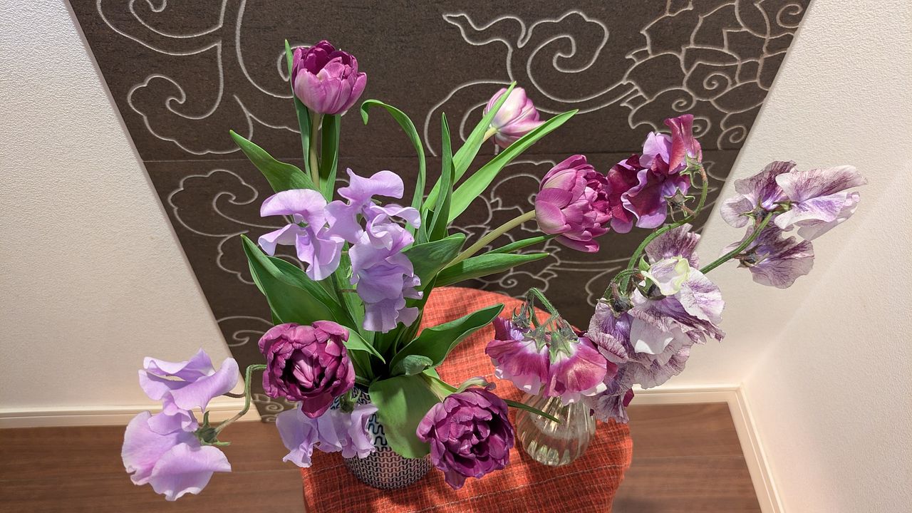 母の卒寿のお祝いにと、紫のお花、購入しました。スイートピーも紫だけど色々でとっても綺麗でした。チューリップが咲いてくるのが、楽しみです。