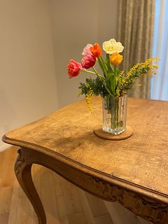 チューリップとミモザが主役の贅沢な春のおまかせブーケはいかが。かわいい組み合わせでお届けします。