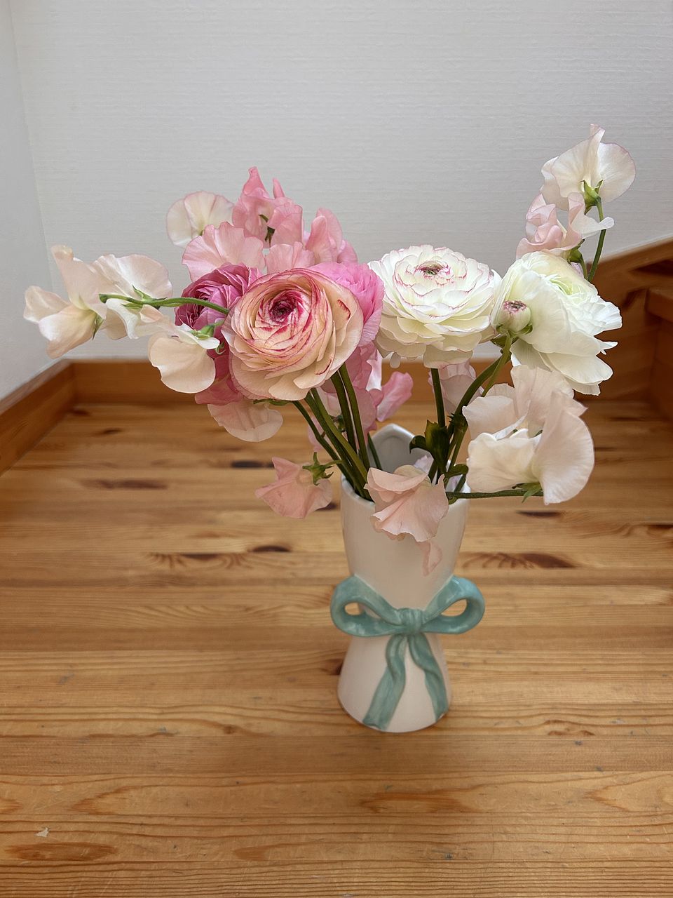 スイートピーの軽やかな花びらと、ラナンキュラスの幾重にも重なる花姿を束ねた、やさしいピンク色のブーケ🌸