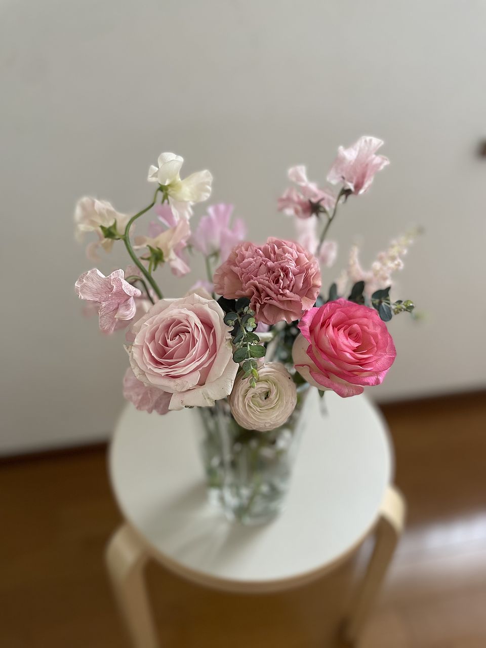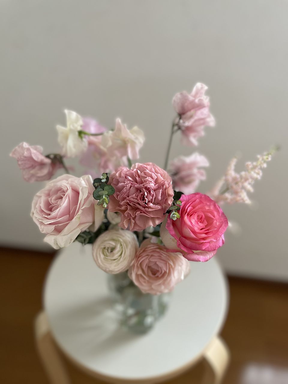 やわらかなピンクを中心に、今いちばん可愛い旬の花をぎゅっと束ねたおまかせブーケ🩰💗