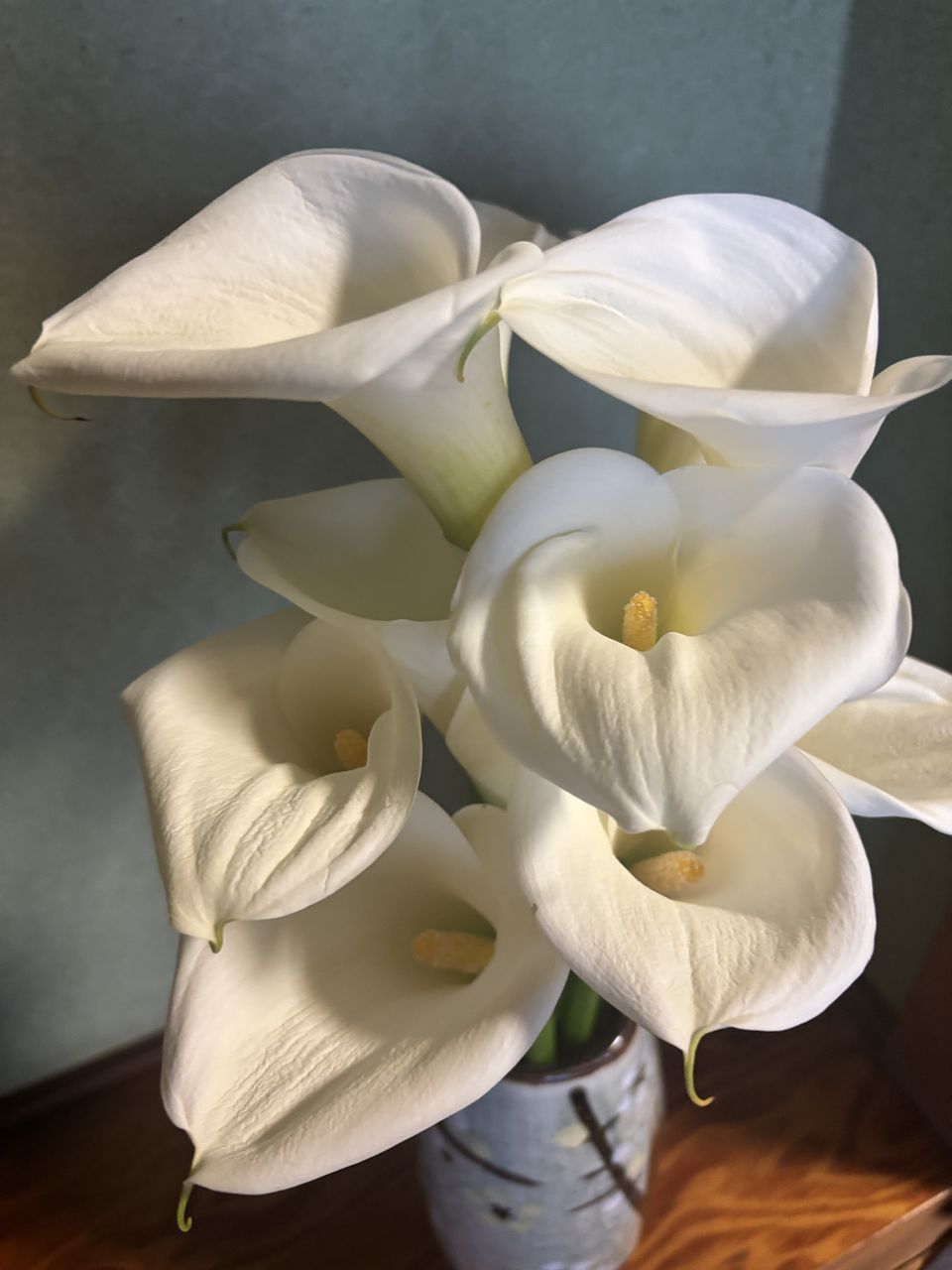 届いて6日目になります。 届いてすぐに水あげして、昨日まではとてもみずみずしく凛と咲いていました。 10本あり存在感はありますが、上品な純白のカラーでした。 5日目になったら急にシワが増えてきて、色も徐々にくすんできた感じです。