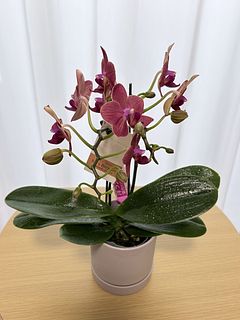 シックで洗練された雰囲気を持ち、上品さの中にモダンな存在感を漂わせます。白やピンクの胡蝶蘭とは一線を画す、個性派の一鉢です。