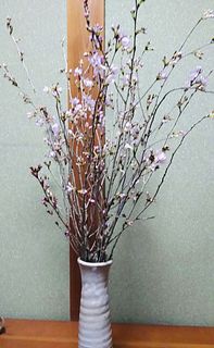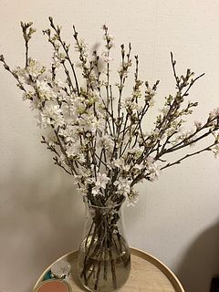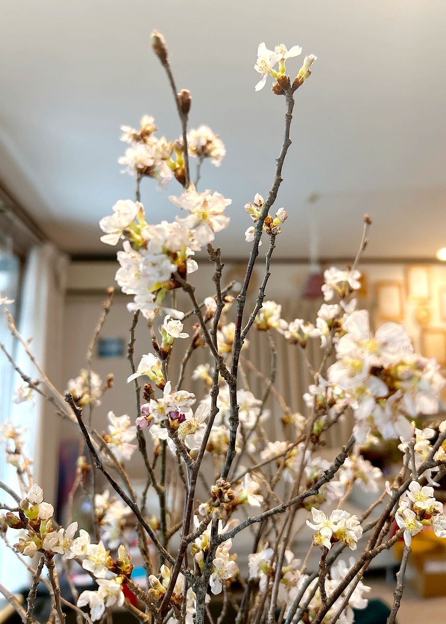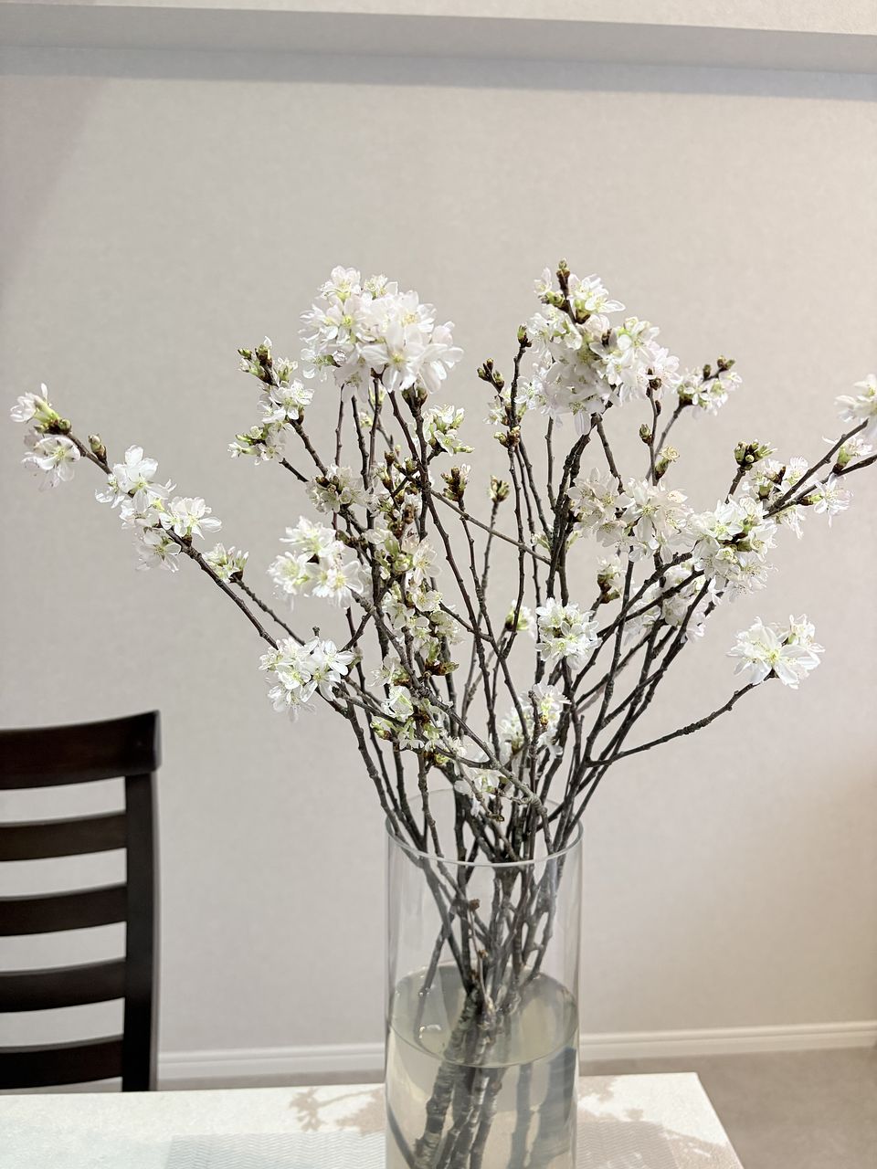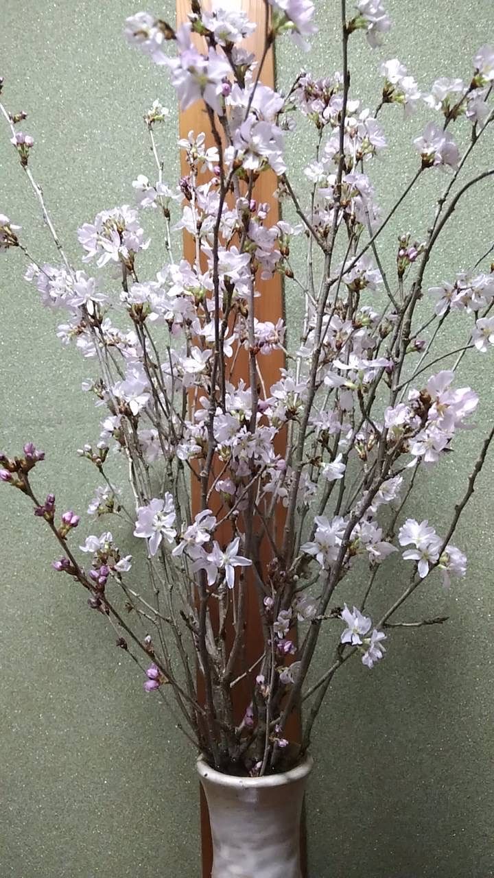 届いた時は硬い蕾のついた枝だったのですが、今は満開の桜が咲いています。 家でお花見を楽しんでいます。