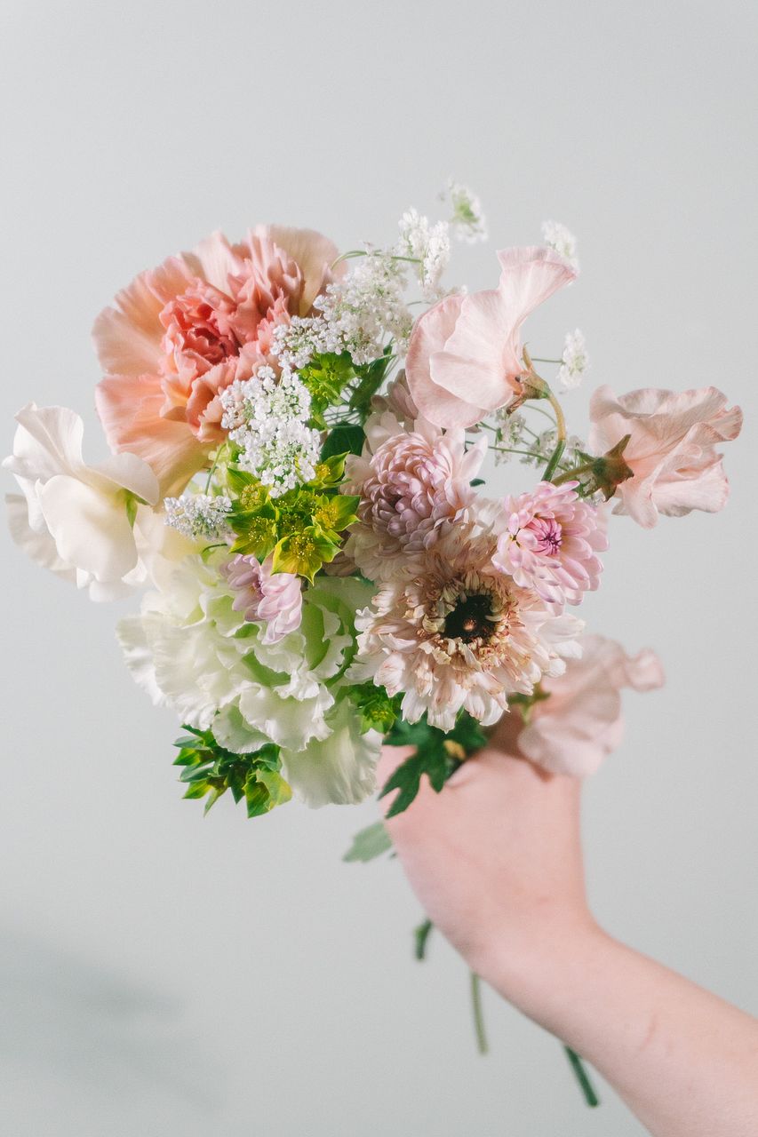 やわらかなピンクを中心に、ホワイトとグリーンを合わせて、今いちばん可愛い旬の花をぎゅっと束ねたおまかせブーケです🍡