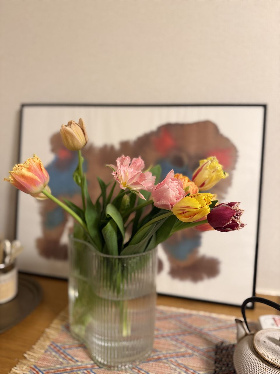 色とりどり、形も様々❣️ 水あげ中にパッと満開になったものもありましたが部屋中が春色でポカポカ気分になりました💕 この大きさならもう少し本数があってもいいかもしれませんね〜