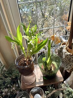 すずらんの根っこのボリュームが 思った以上にあって 何に入れようか正直迷いました。 手のひらに乗るくらいの丸いガラス容器に 丁度良く入りました。 白くて可憐なお花にもじゃもじゃの根っこ、 見ていて楽しいです。