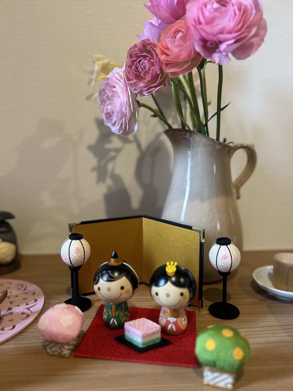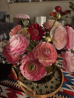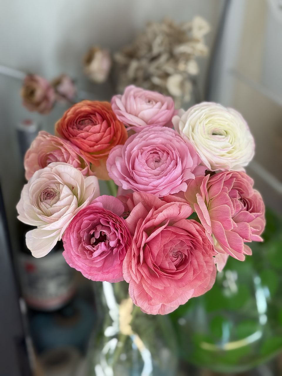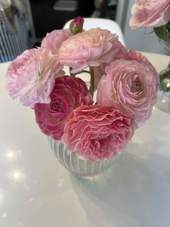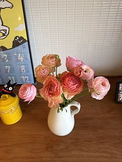 可愛いお色のラナンキュラス🩷 大好きなお花の1つです💕 前回購入の桜が満開で並べて飾っています🌸 長く楽しめるようにお手入れ頑張ります😊