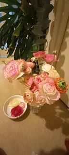 雪の中無事届きました😊 ヤマトの配達員さんありがとう! フィルムの中で外側の花弁が開いて変なクセがついていたり、花弁が裂けてしまったりしていますが、開花すれば目立たなくなるかな?と思います。 水揚げ開始から1時間ほど経ちましたが、少しずつ開き始めました。 いろんな色味のピンクでかわいいです😍 水揚げが完了したらもっとゆったり生けてあげます。