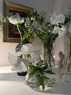 ホワイトカラーのラナンキュラスやスイートピーがまるで白鳥が優雅に舞っているよう🦢