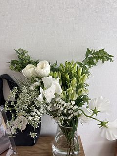 はじめてのネットで購入の切り花。届いた時は箱の大きさを見て予想よりも小さかったかな…?と思いましたが、広げたら良いボリューム感でした。 開封時に2,3パラパラと花弁が落ちる子はありましたが、気になりはそれくらい。ほぼほぼ満足! いろいろな白いお花で構成されていて統一感もあり、1番最初のセットをこちらにしてよかったなと思います。最初なので評価は真ん中のまあまあにしておきます。今後も楽しみ!