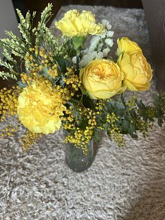 今の時期にしかないミモザとラナンキュラスにカーネションとスターチスもひよこカラーにこだわって、もこもこひよこが寄り添っている姿をイメージして束ねました😍