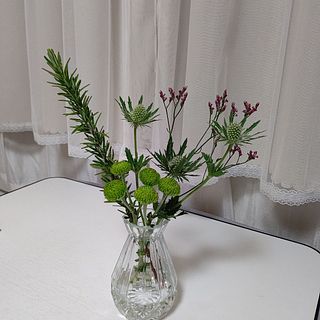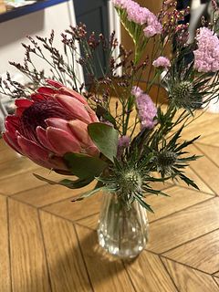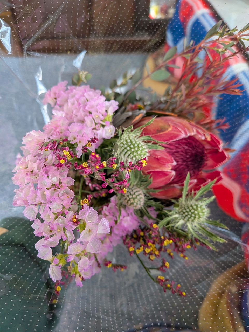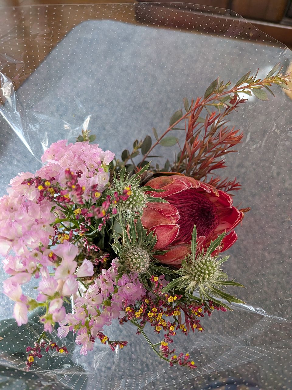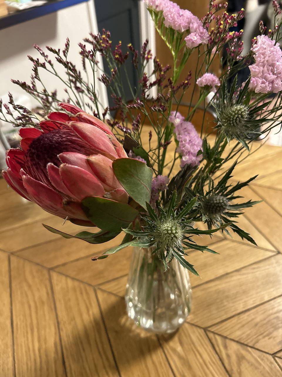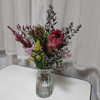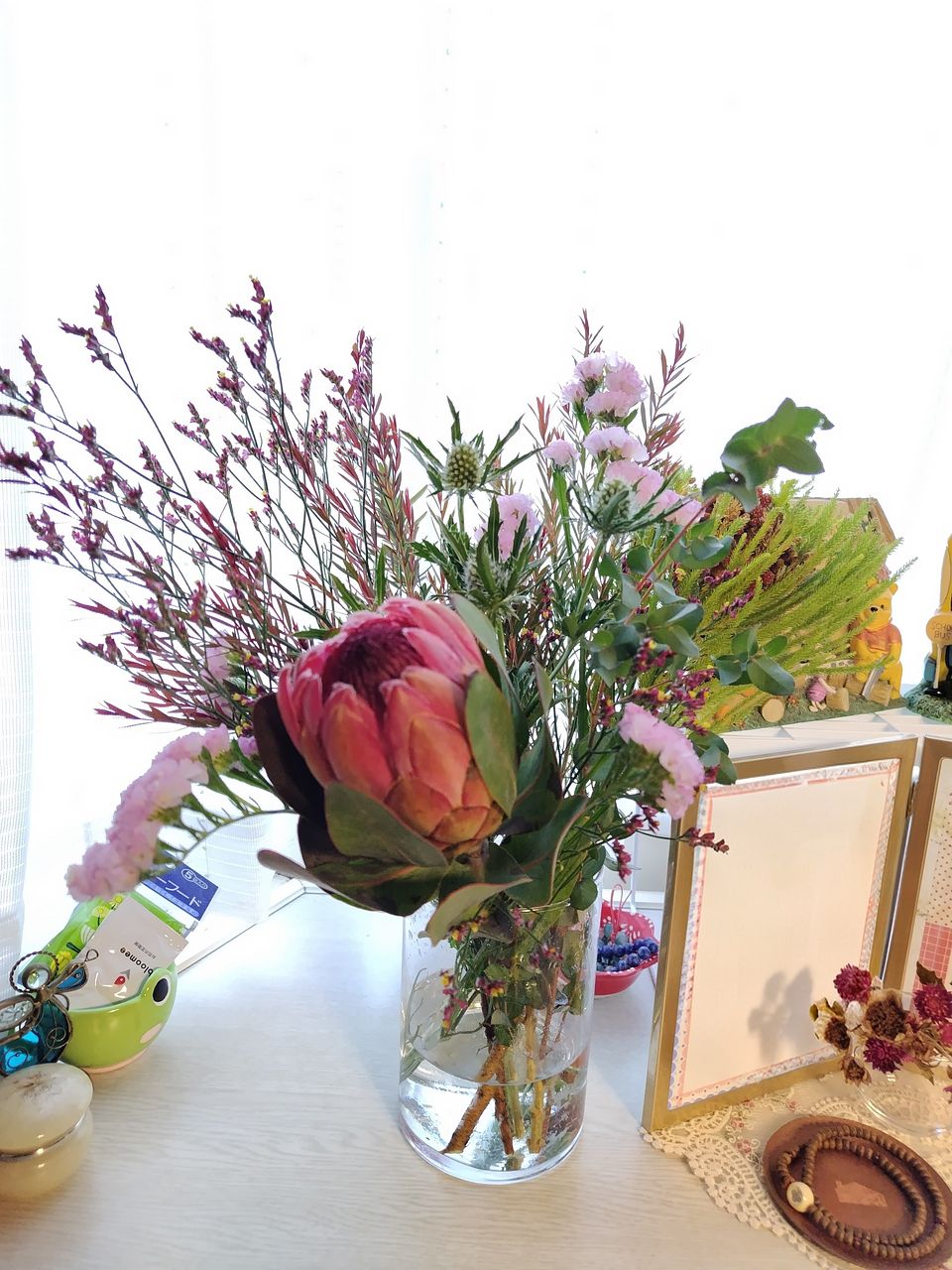 少し分けて飾りました マムとソリダコは家にあったもの 圧巻の存在感のプロテア ボリュミーで豪華! お花屋さんでは見かけない種類がたくさんありとても満足してます